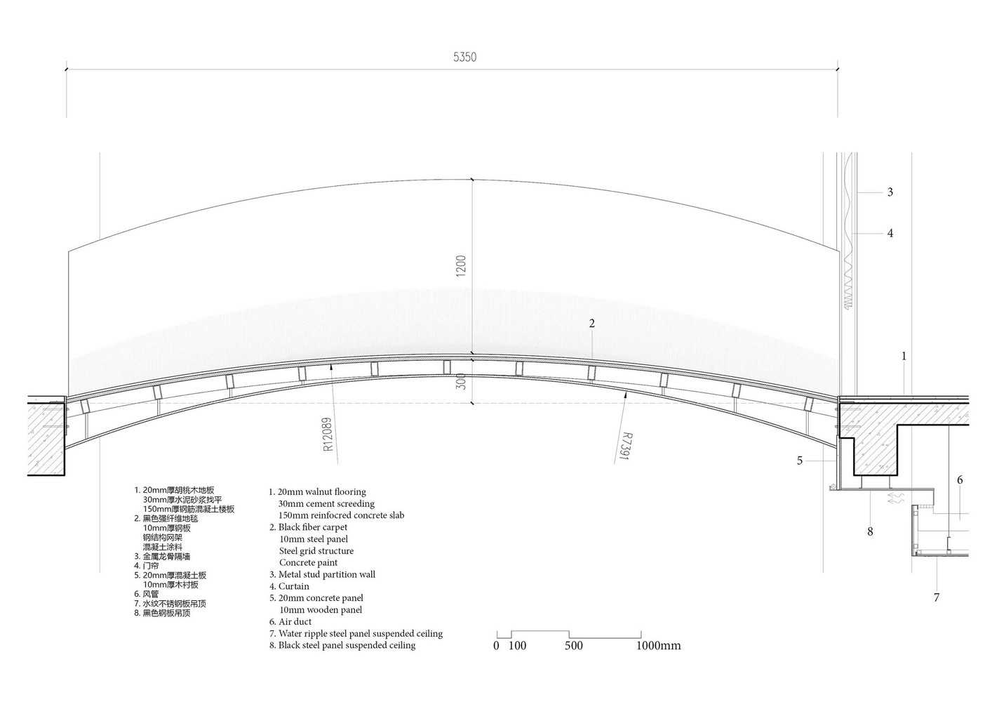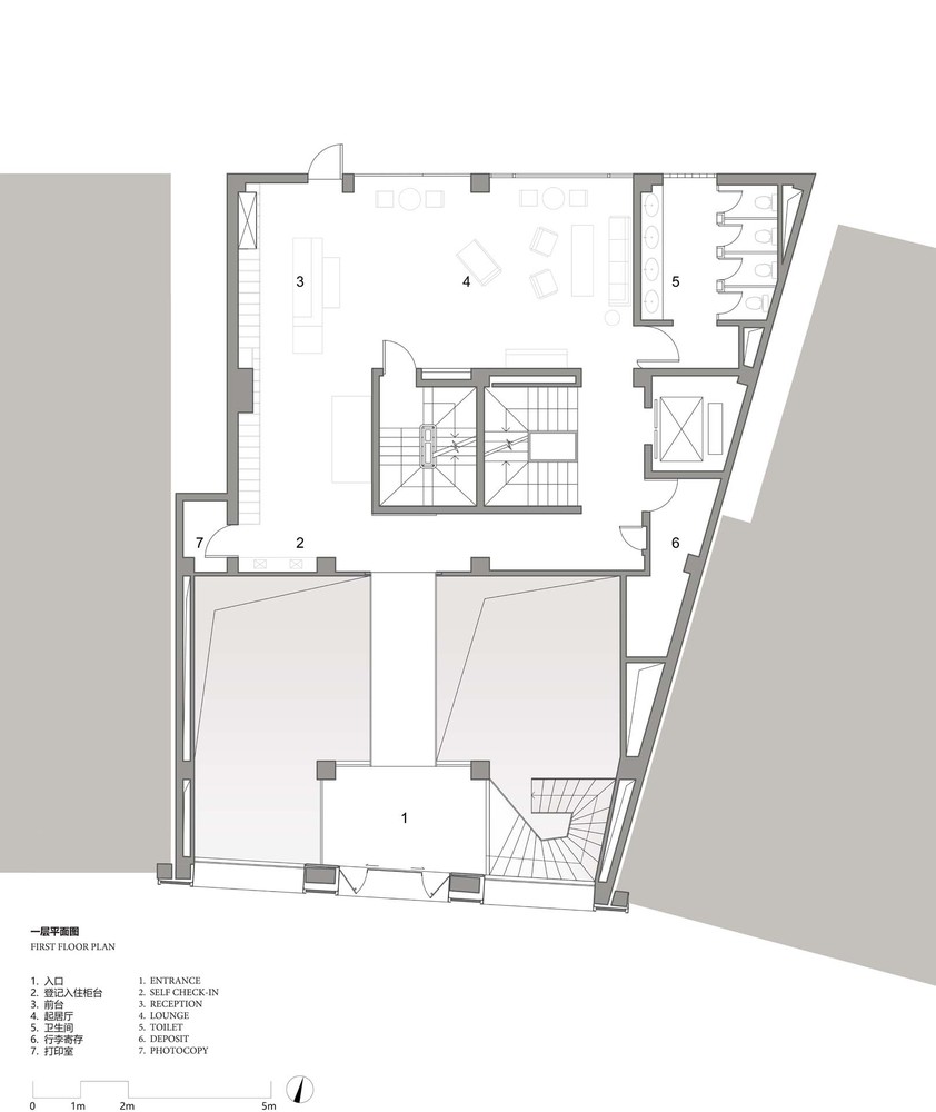 Проблемы оригинальной конструкции — низкая высота пола и репрессивный подвал. Поэтому мы открыли весь первый этаж, чтобы сформировать непрерывное вертикальное пространство с мостом в мосту. Под мостом находится внутреннее расширение города; напротив моста находится отель, на расстоянии от шума.