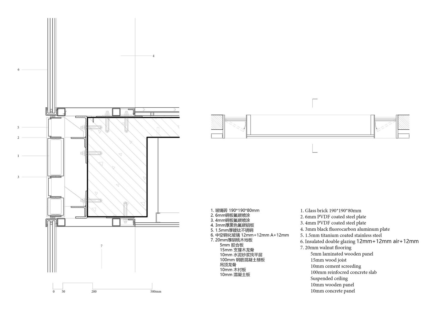 Стены-столпы на южном фасаде содержат два управляемых окна, которые специально спроектированы для поддержания полного вида падающей воды при открытии. Другие детали в комнатах включают отверстия на стене балкона и две комнаты с видом на мост, а также треугольное зеркальное окно, расширяющее визуальное восприятие крошечного пространства.