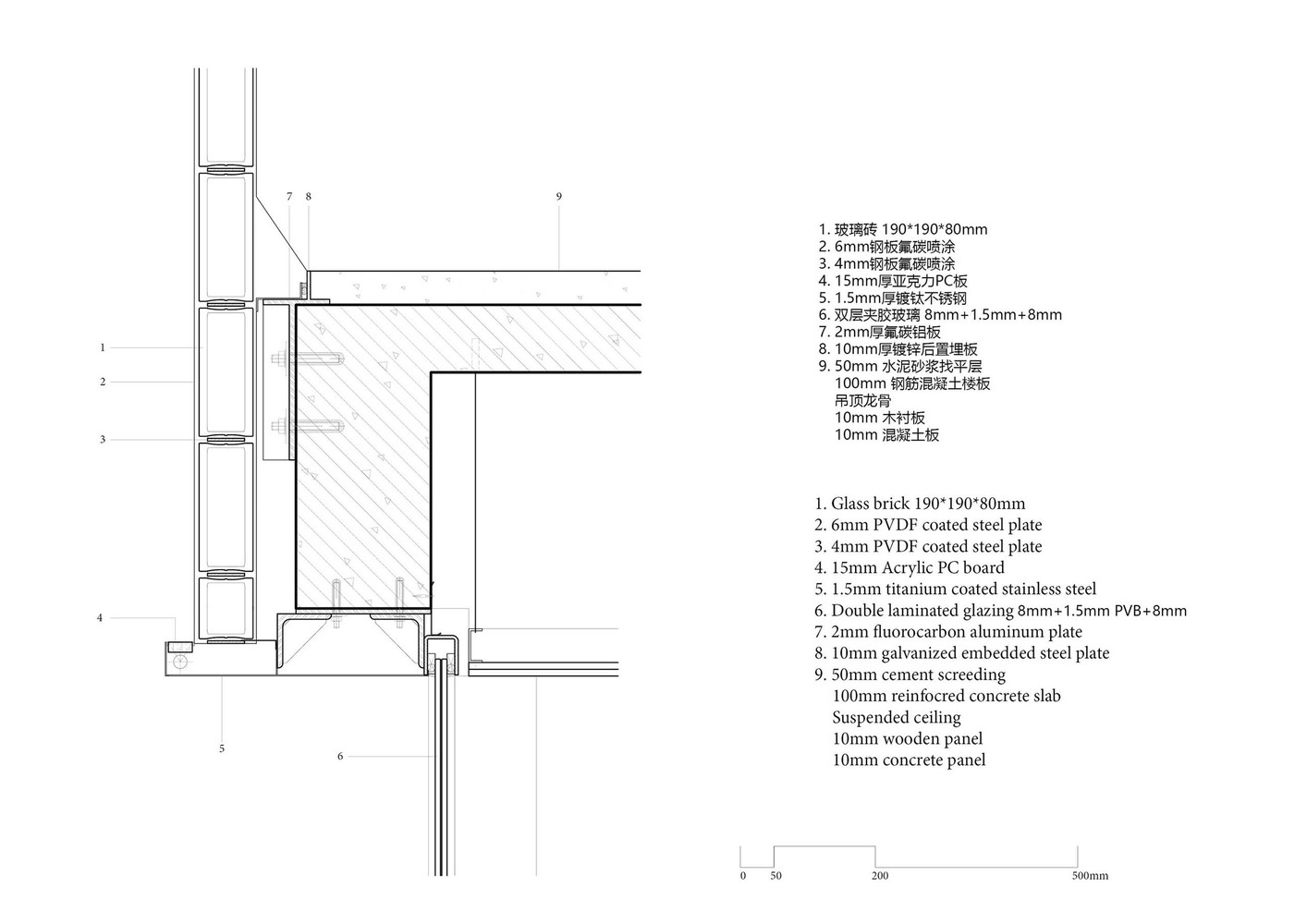 Берег реки и водопад. Пространства и материалы выражены на основе истории «моста». Он предназначен для создания впечатления водопадного фасада в конкретном городском контексте. Навесная стена выполнена из стеклянных кирпичей, которые уравновешивают приватность и легкость.