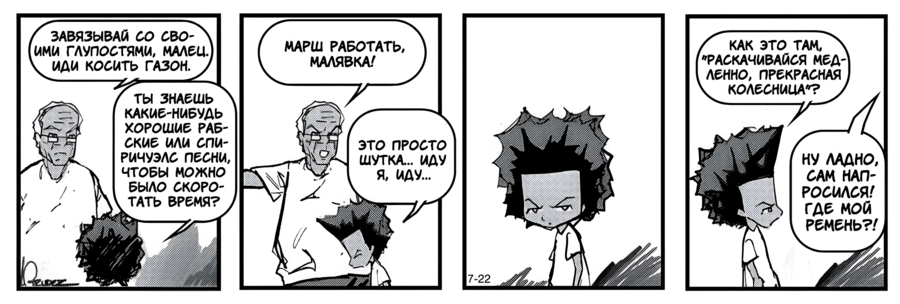 Aaron McGruder, «The Boondocks», газетная полоса, 1999. © Aaron McGruder / Universal Press Syndicate. Использован русский перевод (публиковался под названием «Ghetto»), daily strip № 7/12