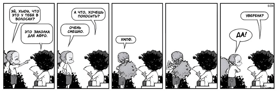 Aaron McGruder, «The Boondocks», газетная полоса, 1999. © Aaron McGruder / Universal Press Syndicate. Использован русский перевод (публиковался под названием «Ghetto»), daily strip № 7/5