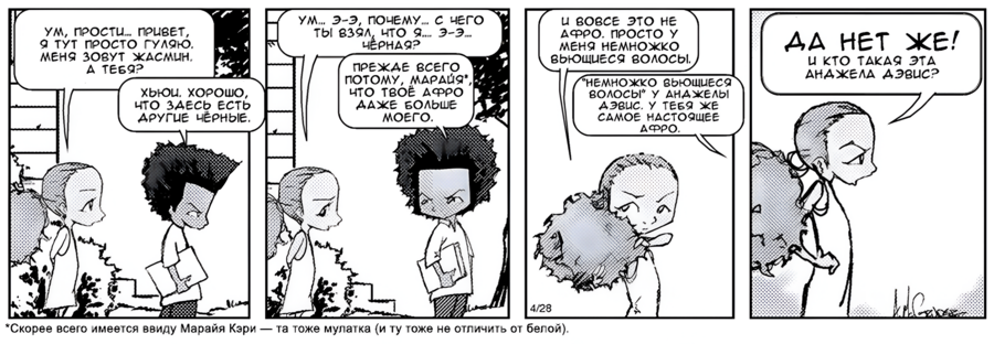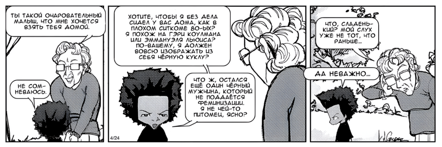 Aaron McGruder, «The Boondocks», газетная полоса, 1999. © Aaron McGruder / Universal Press Syndicate. Использован русский перевод (публиковался под названием «Ghetto»), daily strip № ¼, 11/11, 1/7