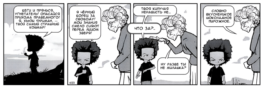 Aaron McGruder, «The Boondocks», газетная полоса, 1999. © Aaron McGruder / Universal Press Syndicate. Использован русский перевод (публиковался под названием «Ghetto»), daily strip № 7/4