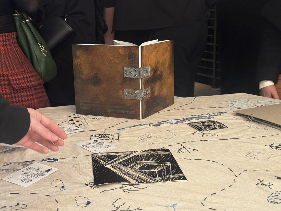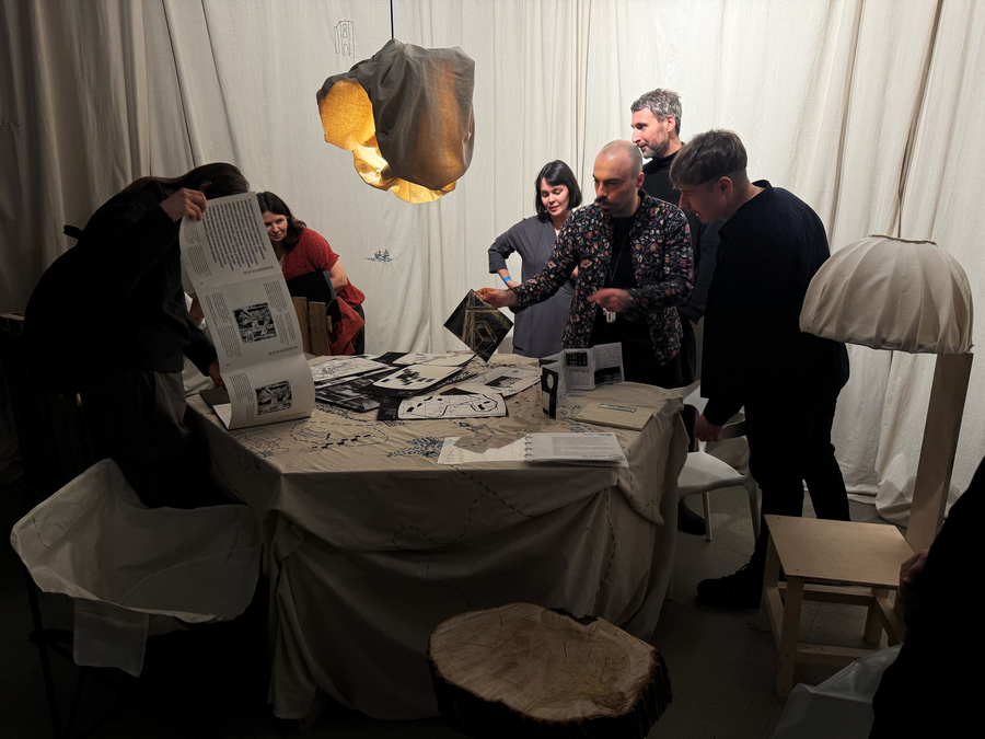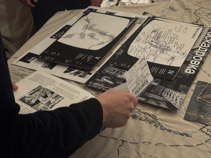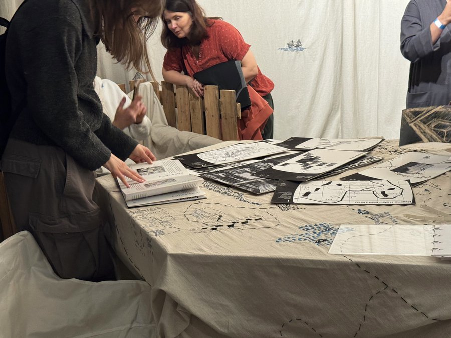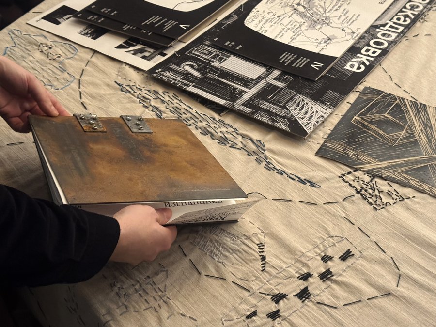 Для фестиваля наша группа подготовила оформление экседры на втором этаже выставочного пространства, в которой были представлены итоги личных размышлений. Концептуально она освобождена от всех лишних элементов и приглашает к вдумчивому осмыслению территории, представляя из себя лаконично оформленный натуральной тканью стол с зинами по индивидуальным темам исследований. Каждому зину соответствует свой стул, образно концентрирующий в себе философию его автора. Экспозиция буквально «пронизана» стежками, изображающими отложившуюся в памяти ментальную карту района.