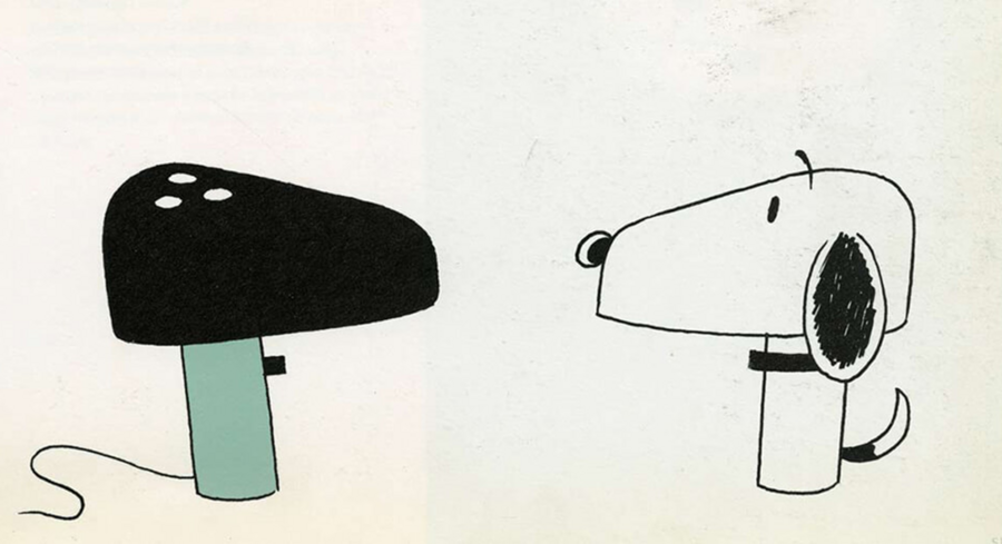 Лампа Snoopy («Снупи»), Акилле, Пьер Джакомо Кастильони, 1967. В форме светильника легко прослеживается образ популярного в то время героя из мультфильма «Peanuts» (с англ. арахис)