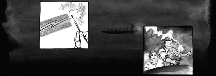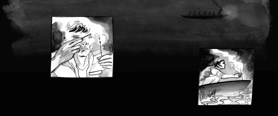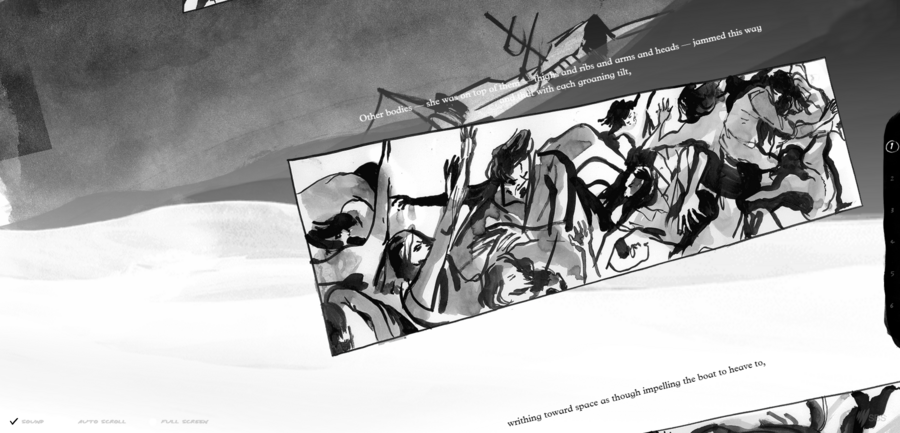 Интерактивный графический роман «The boat», иллюстратор Мэтт Хьюн, 2015 г. Фреймы дрожат после звука удара о лодку