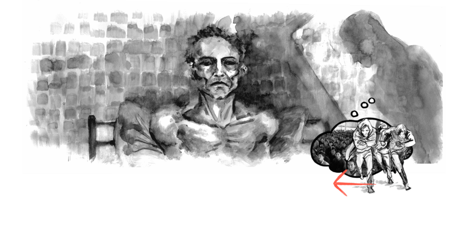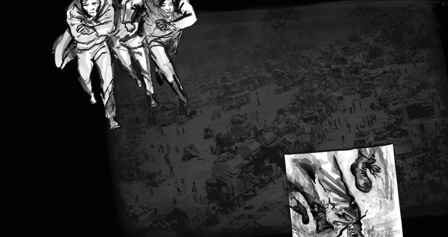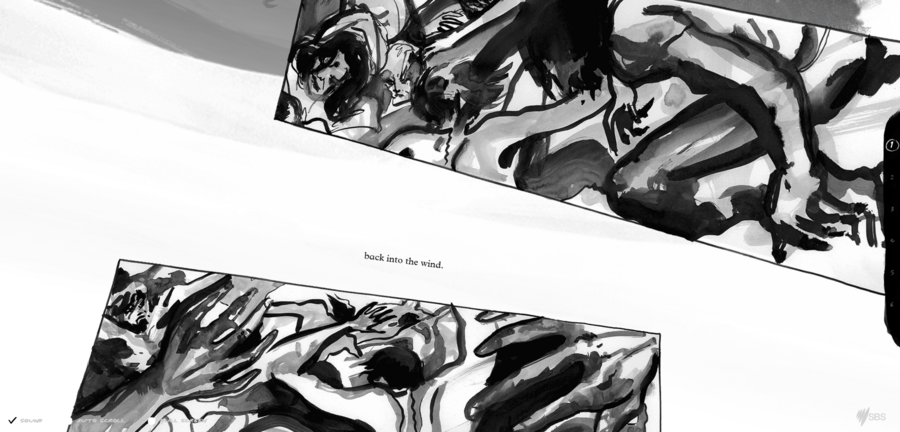 Интерактивный графический роман «The boat», иллюстратор Мэтт Хьюн, 2015 г. Пример: один из выживших ударяет Мэй по лицу, когда она украла бутылку воды.
