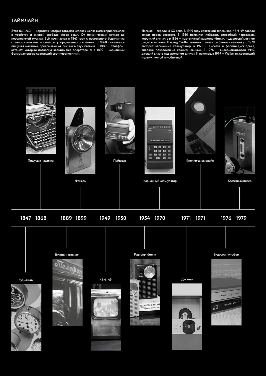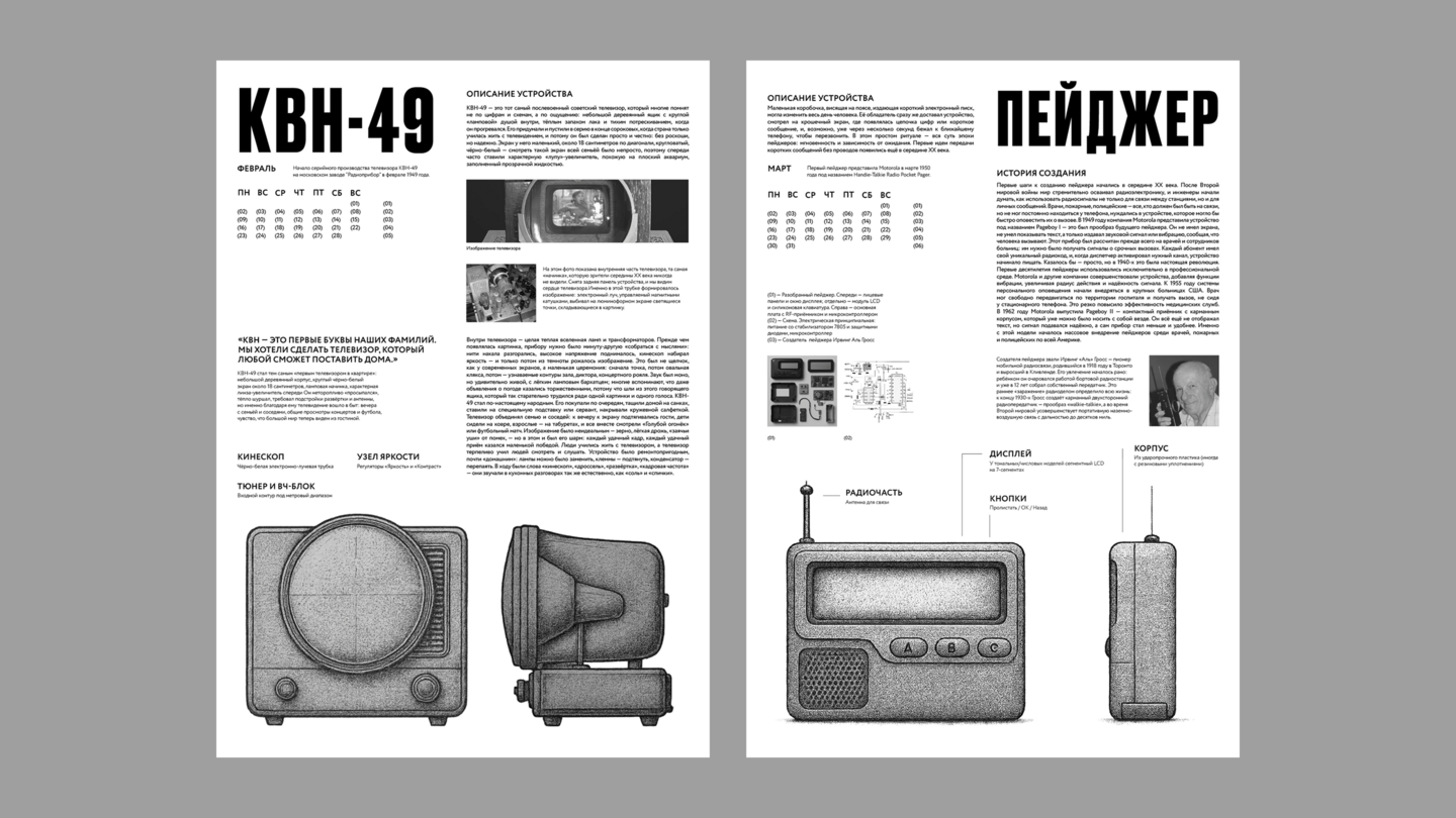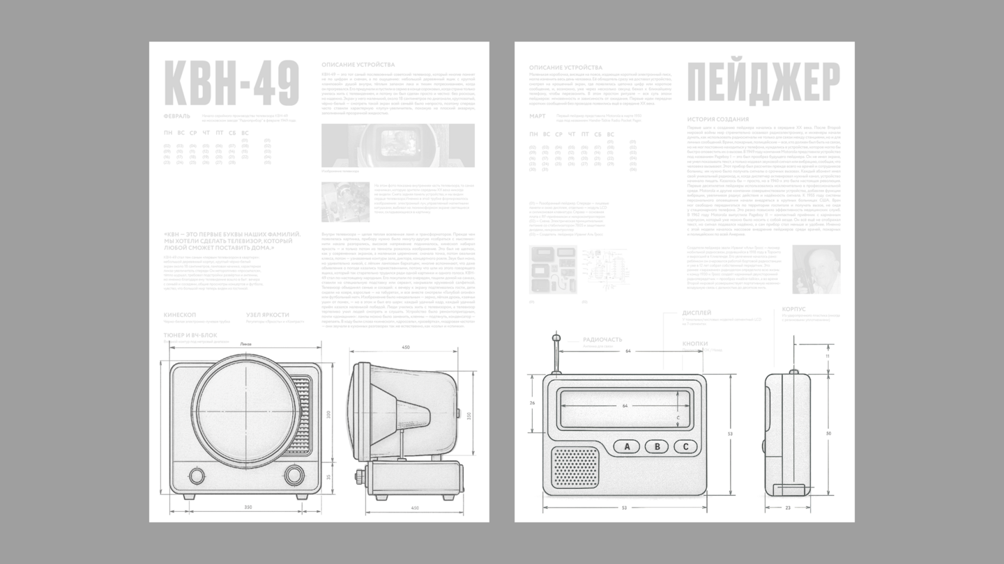 Для финальной концепции я взяла предметы, которые когда-то были популярны, а сейчас они исчезли. Для первых трех полос я взяла пейджер, телефон с монетками и телевизор с лупой КВН-49