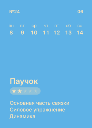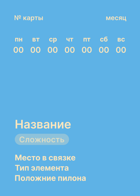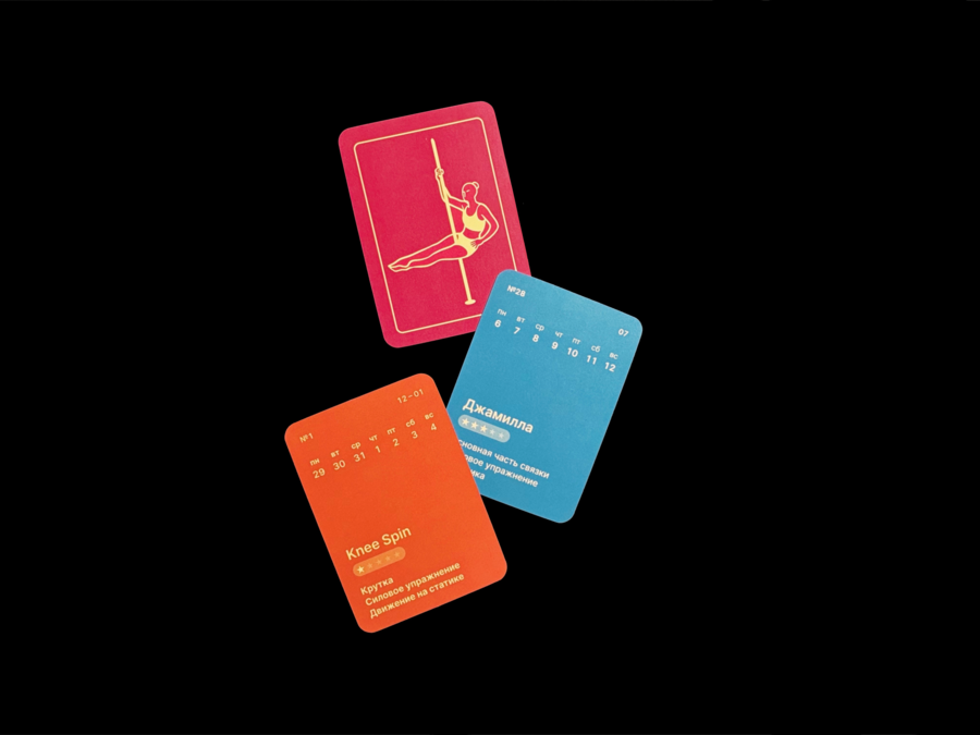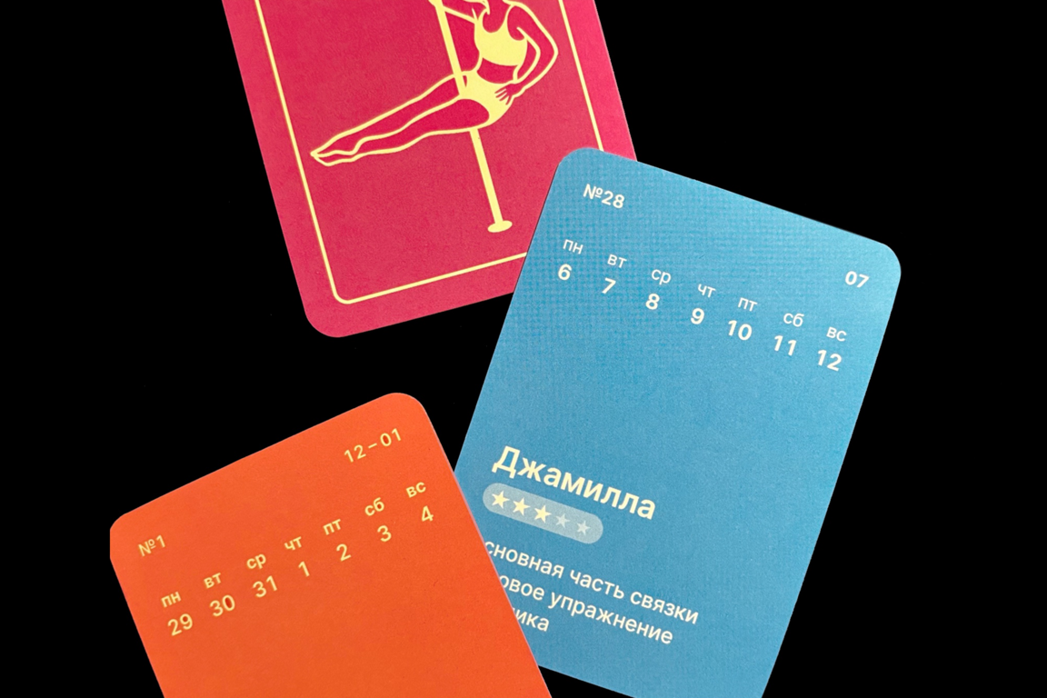 Этот проект представляет собой колоду из 53 карт на каждую неделю 2026 года. На картах есть календарная сетка на неделю, описание одного гимнастического элемента, исполняемого на пилоне, и схема его выполнения.