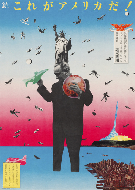(1) Выставка работ Экина. Таданори Ёкоо. 1970 г. (2) Плакат для серии статей в газете Yoimuri Shinbun. Это Америка. Таданори Ёкоо. 1968 г.
