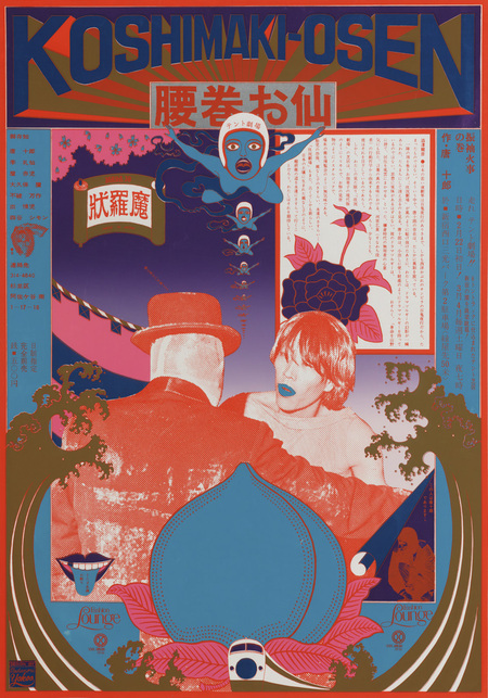 Наглядный пример — плакат «Koshimake Osen 2» (1969 года). В этой коллажной композиции довольно много элементов и символов. В центре — монохромная фотография, которую обрамляют волны, отсылающие к традиционной гравюре. Таким приемом автор соединяет современное пленочное изображение с историческим художественным.