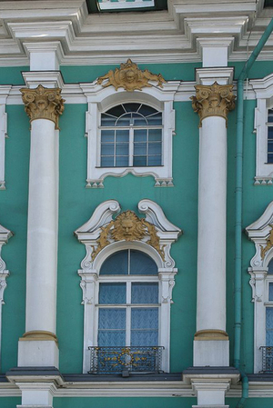Фасад Зимнего дворца обильно дополнен декором. На нём присутствуют многоступенчатый рельеф карниза, массивные наличники на окнах, а также колонны. Если отталкиваться от классификации ордерных систем, то данные колонны явно напоминают и несут в себе черты ионического ордера. На первом уровне у колонн есть база, стволы с отсутствующим рельефом, капители с каннелюрами, а также волюты и небольшой объём листьев рядом. На втором ярусе, используется композитный ордер, сочетающий в себе элементы ионического и коринфского.