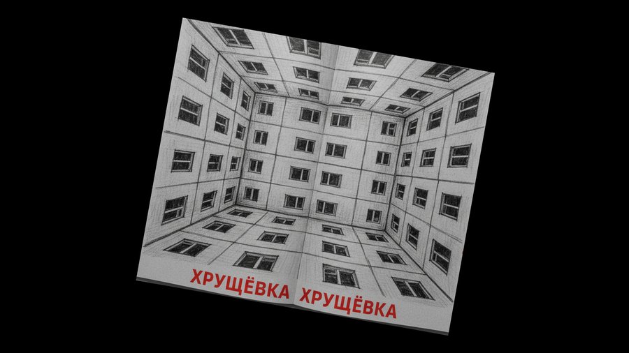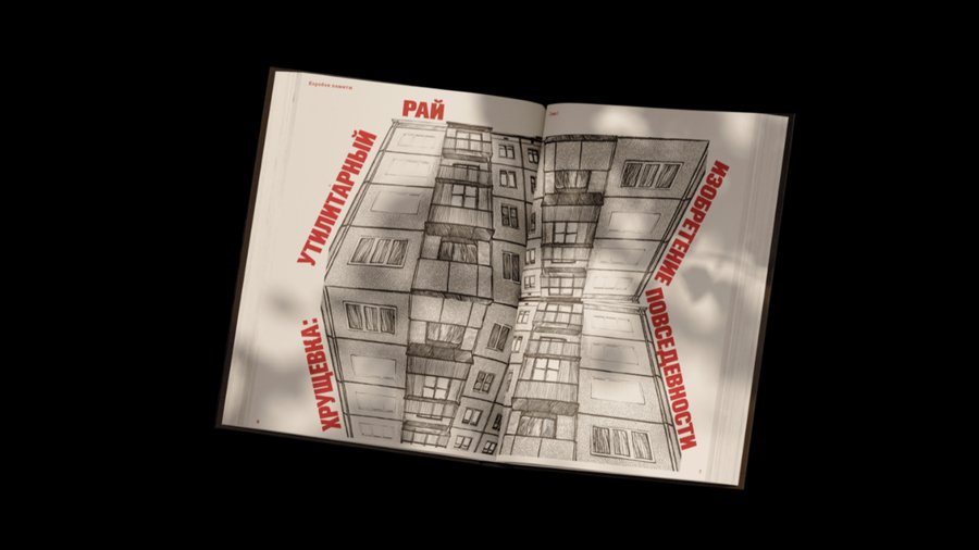 разворот зина, вид сверху. На страницах — графитный карандашный рисунок типовой панельной хрущёвки, вид снизу вверх. Линии — ручные, немного неровные, выразительные, с затемнением окон. По периметру разворота крупные красные надписи заглавными буквами: слева вертикально: «УТИЛИТАРНЫЙ РАЙ», снизу: «ХРУЩЁВКА», справа вертикально: «ИЗОБРЕТЕНИЕ ПОВСЕДНЕВНОСТИ». Цвета — чёрно-белый рисунок, серый фон бумаги, яркий красный текст.