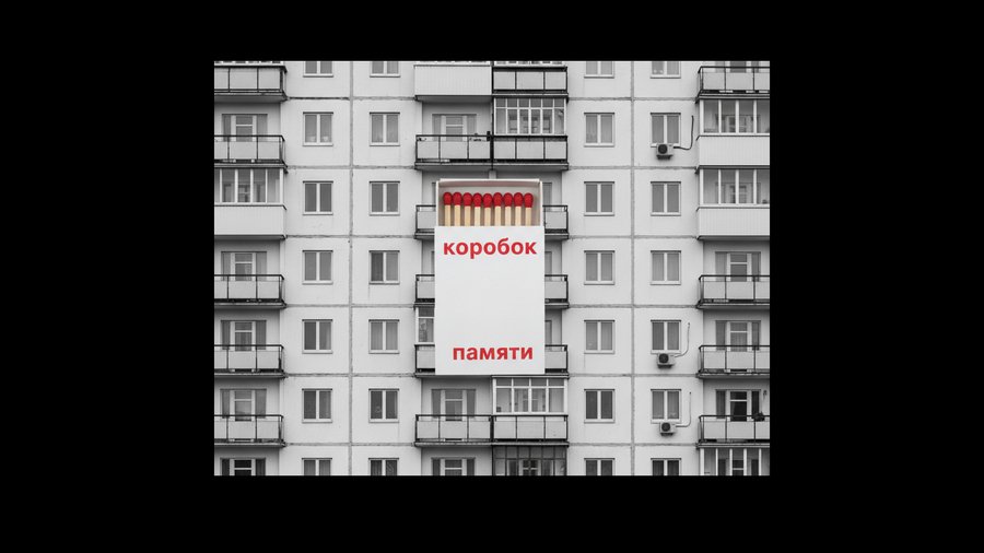 Чёрно-белая фотография типовой советской многоэтажки, снятая фронтально, фасад строго геометричный, с ритмом одинаковых окон и балконов. На некоторых окнах — кондиционеры, занавески, остеклённые балконы. В центре композиции вставлен крупный визуальный объект: белая коробка спичек, слегка в перспективе, будто приклеенная на фасад. Из коробка видны красные спички с бежевыми головками. На коробке написан текст красным шрифтом без засечек: сверху слово «коробок», снизу — «памяти». Цвета приглушённые: чёрно-белое здание и контрастная бело-красная вставка.