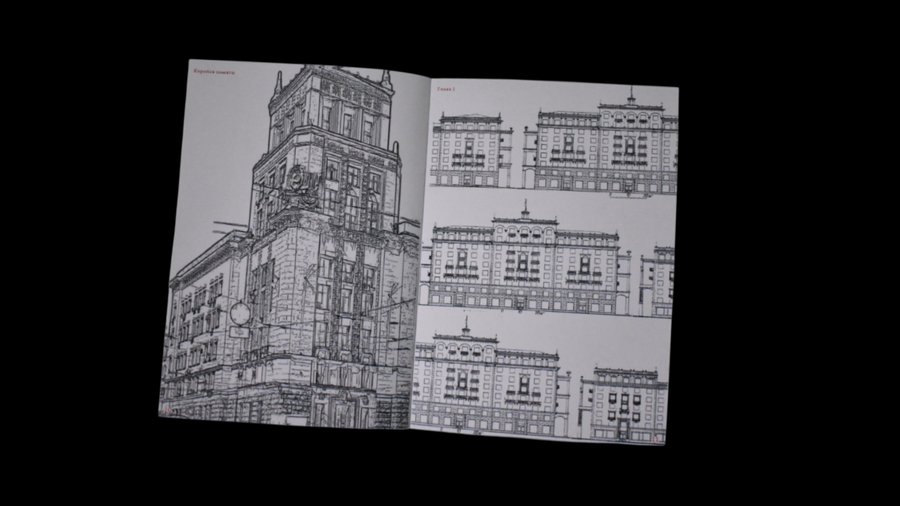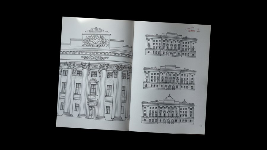 разворот журнала, вид сверху. На страницах — архитектурные чертежи в стиле линейного рисунка тушью. Левая страница — крупный фрагмент фасада сталинского здания: массивные колонны, декоративные элементы, лепнина, эмблемы, часы. Правая страница — повторяющиеся фасады одного здания, выстроенные рядами (по три рисунка сверху вниз), каждый с мелкими вариациями. Общая палитра — чёрно-белая, лёгкий сероватый фон бумаги.