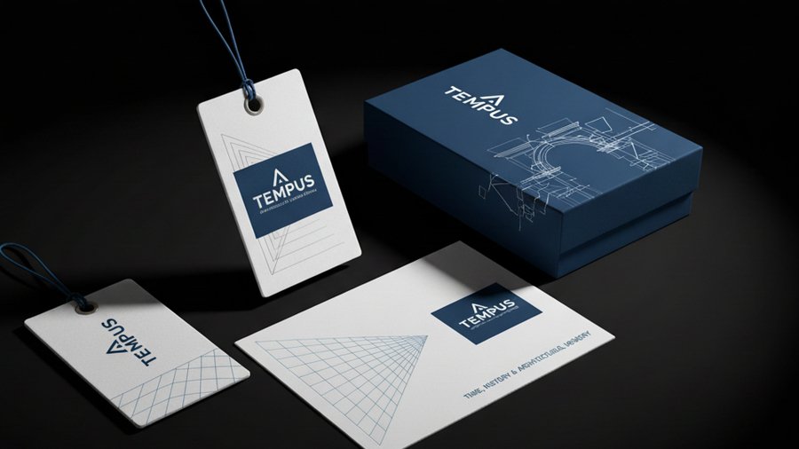 Минималистичное фото фирменного стиля для архитектурного бюро TEMPUS. Элегантный набор фирменных предметов, расположенных на темном, В композиции: темно-синяя прямоугольная подарочная коробка с современным логотипом TEMPUS и нежным белым архитектурным рисунком, две премиальные белые бирки с темно-синими геометрическими элементами брендинга. Композиция подчеркивает геометрию, четкость линий и визуальную иерархию. Цветовая палитра: глубокий синий, чистый белый и мягкий серый. Общее настроение: современный, интеллектуальный, премиальный, архитектурный минимализм.