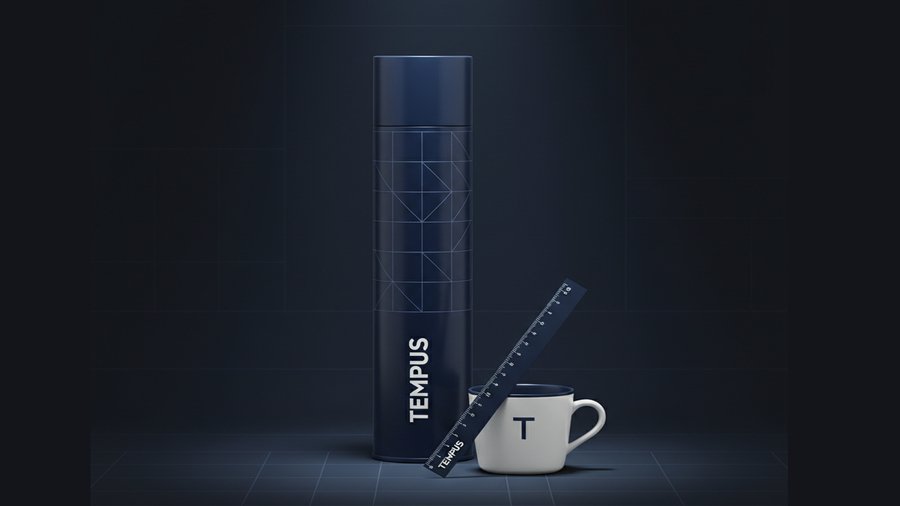 3. сгенерируй изображение: две удлиненные темно-синие фирменные коробки с изящной архитектурной графикой и четкими логотипами TEMPUS; набор линеек темно-синего и белого цветов с минимальными отметками и названием TEMPUS; современная матовая белая кружка с геометрическим силуэтом и надписью «TEMPUS» темно-синего цвета сбоку. ТЦветовая палитра: темно-синий, светло-голубой, белый и холодные серые оттенки.
