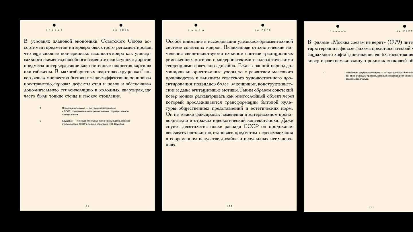 In the course of the study, I looked at the visual image of carpets, how they were used in different spaces, why they became such an important element of welfare, and what legacy they left behind after the collapse of the Soviet Union.
