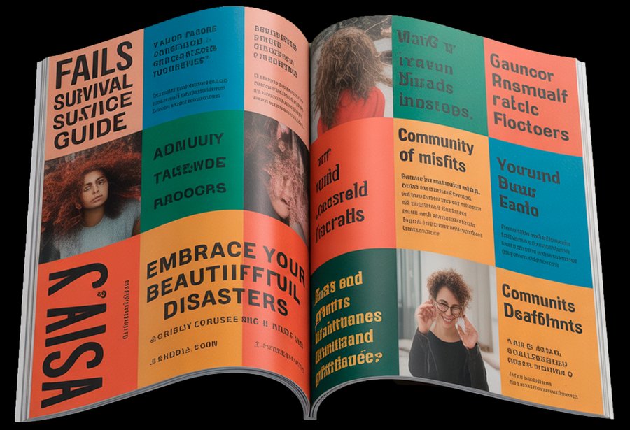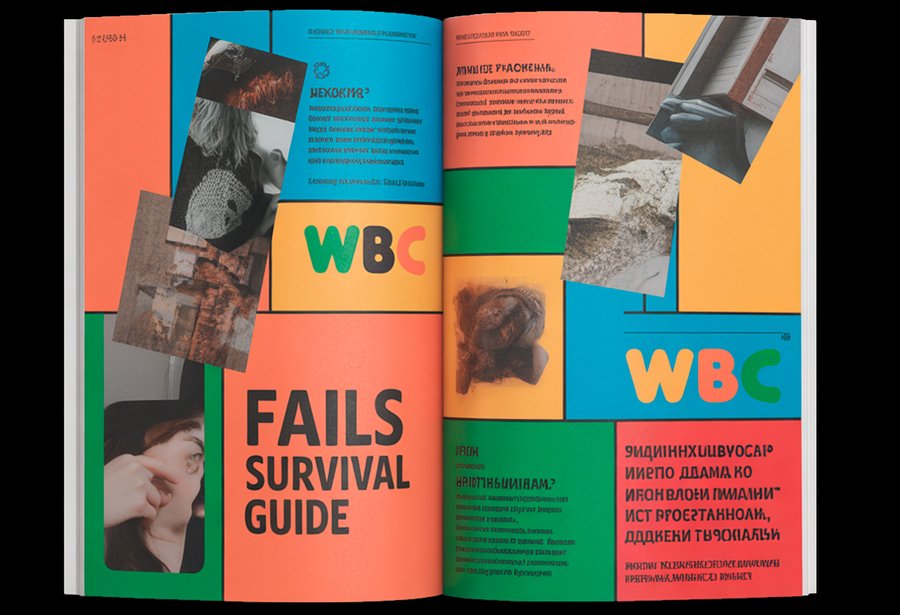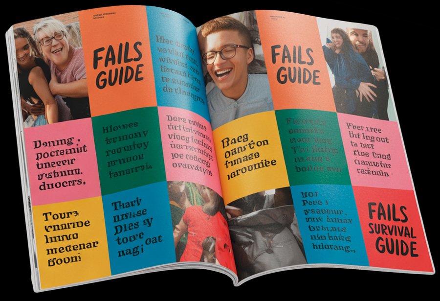 Prompt: Create a realistic magazine mockup of «Fails Survival Guide» featuring a vibrant patchwork layout using the WBC color palette (F27E88, 04ADBF, 3A8C46, F28F16, F25430) against black backgrounds. Design the spread with collage-style arrangements, overlapping authentic photography, and irregular story blocks in the brand’s playful typography (Doughy for headlines, Agrandir for body text, Tschichold for captions). Incorporate the patchwork metaphor through geometric color blocks and diverse content layouts that balance humor and support. Present the design as a photographed open magazine to show how the spread appears in context, emphasizing the contrast between the black background and vibrant elements.