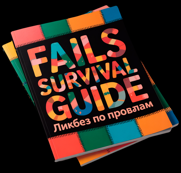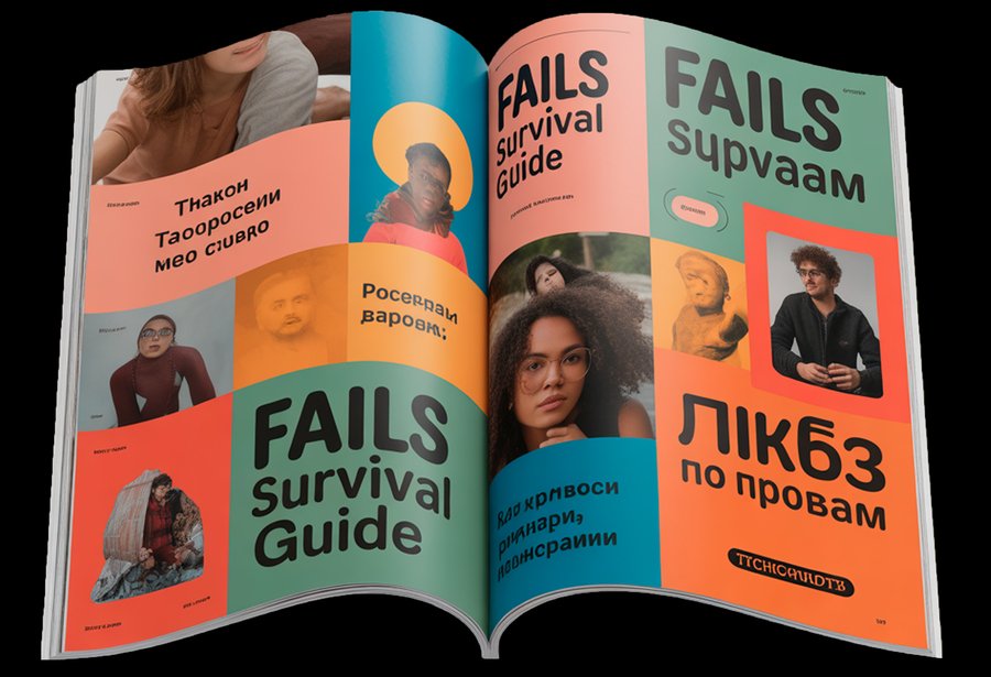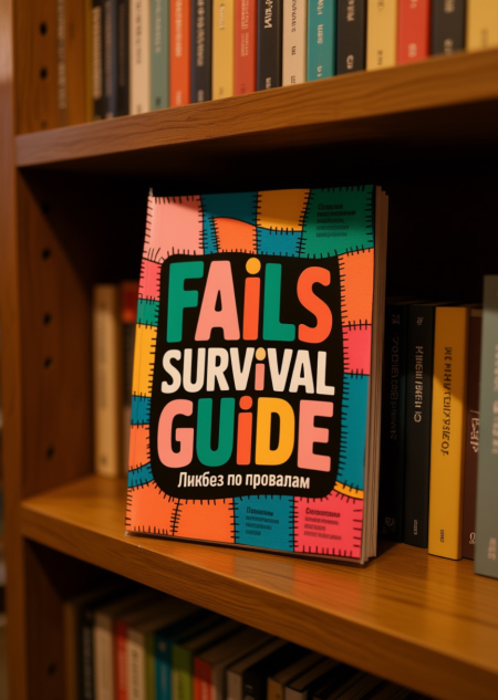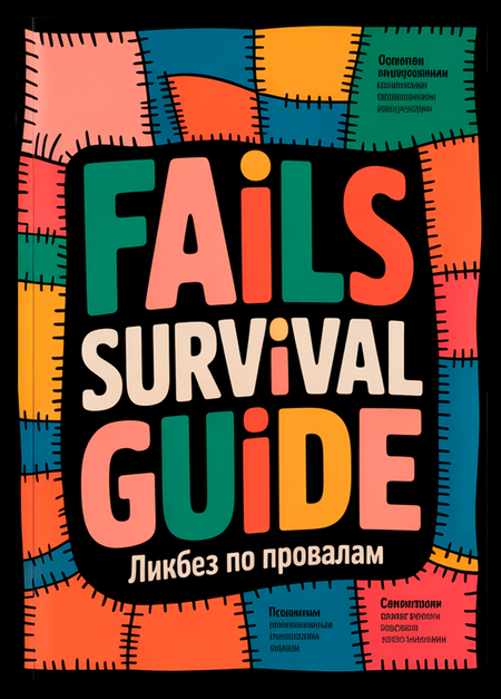 Prompts: 1. A photorealistic, high-resolution image of the «Fails Survival Guide» magazine cover lying flat on a wooden bookshelf inside a cozy, well-lit bookstore. The cover features bold, colorful, blocky text reading «FAILS SURVIVAL GUIDE» with Russian text «Ликбез по провалам» underneath. The background of the cover has a patchwork quilt design with vibrant orange, teal, pink, and yellow squares stitched together. The bookshelf is filled with other books, slightly out of focus, creating a sense of depth. Soft, warm lighting from overhead lamps highlights the texture of the magazine’s glossy cover and the wood grain of the shelf. The overall atmosphere is inviting and quiet, typical of a charming independent bookstore.