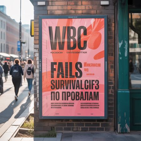 Prompts: 1. Create an advertising poster for «Fails Survival Guide» displayed on a realistic city street wall mockup. Use a solid background of one WBC brand color (F27E88, 04ADBF, 3A8C46, F28F16, or F25430) with the distinctive multi-colored WBC logo prominently featured. Employ the brand’s typography hierarchy — Doughy for bold headlines, Agrandir for supporting text, and Tschichold for details — all in high-contrast white. Design should embody the patchwork community concept through dynamic text arrangement and imperfect geometric elements, creating a bold, energetic composition that celebrates inclusivity and imperfection. Show the poster as physically installed in an urban environment with realistic lighting and surface textures.