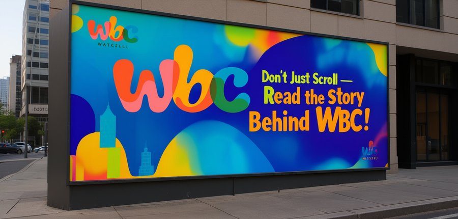 2. Create a vibrant outdoor poster for a WBC magazine using bold blue, yellow, green, and red, featuring a large central slogan like «Don’t Just Scroll — Read the Story!», a small corner logo, and a modern, playful style, shown mounted at a slight angle on an urban wall or pillar.