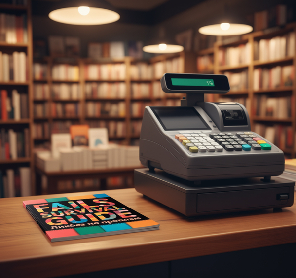 2. A magazine titled «FAILS SURVIVAL GUIDE» with colorful, patchwork-style lettering and Russian text «Ликбез по провалам» on its cover, lying on a wooden counter in a cozy bookstore. The magazine is positioned right in front of a modern cash register, as if it’s about to be scanned for purchase. The scene is warmly