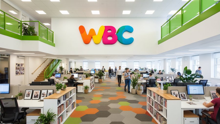 Prompt: Photorealistic, wide-angle shot of a modern magazine publisher’s office at night. Industrial-chic aesthetic with exposed concrete beams and a vibrant city skyline through large windows. A large, light-wood worktable in the foreground is cluttered with design tools (cutting mat, sketchbooks, pencils). Behind it are workstations with warm-toned fabric dividers. Focal point: The large, colorful «WBC» logo on the back brick wall, rendered in its signature overlapping wavy colors (orange, pink, yellow-orange, blue, green). The logo must be prominent, well-lit, and clearly brand the space. Warm, ambient lighting from ceiling spotlights and desk lamps creates a cozy, energetic atmosphere for a creative team working late.