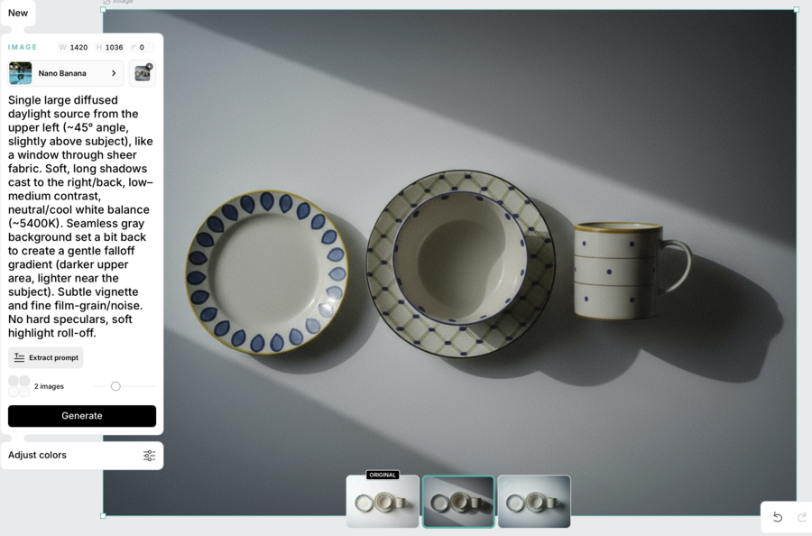 Удачные варианты я вырезала там же при помощи ИИ и помещала в необходимые мне условия при помощи модели nano banana и инструментов «Merge objects» и «Use as prompt references» в Recraft. Необходимые примеры я искала в интернете, а потом просила chat gpt написать по ним промпт для изменения света сцены, фона или ракурса. В отличии от обычных «стилей» в Recraft, которые просто стилизуют изображения кардинально их преображая, «модели» как nano banana позволяют вносить точечные изменения не влияя на общий сеттинг.