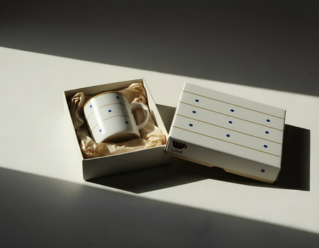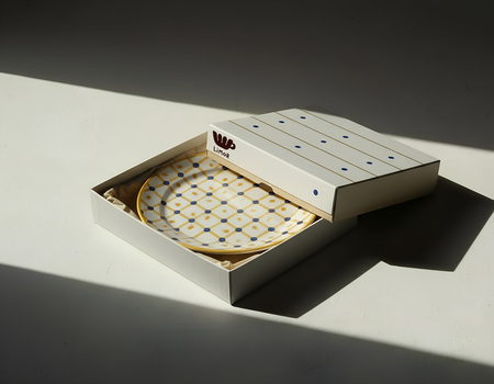 При помощи стиля «product photo» я создала коробку (промпт: «box for a plate on white background»), инструментом «use as prompt references» наложила на коробку паттерн кружки (промпт: «put the pattern of the mug on the box»), положила нужную тарелку внутрь (промпт: «put the plate in the box»), а в дубликате положила кружку, через nano banana применила настройки света. В фотошопе уже вручную добавила лого на коробку. Так получились реалистичные прототипы продукта и упаковки.