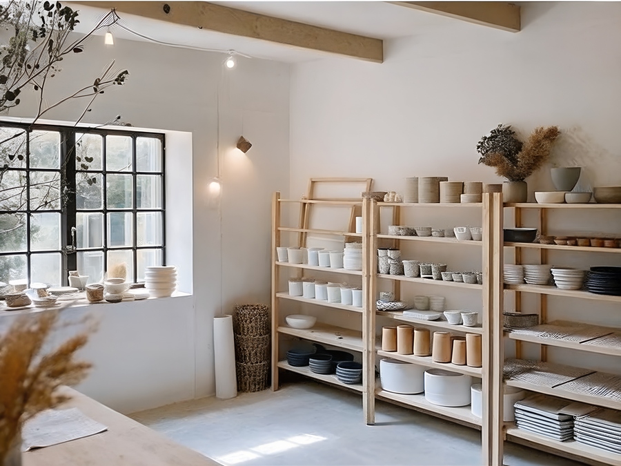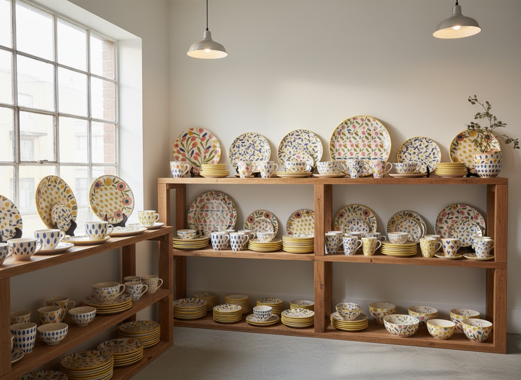 Я также создала стиль для пространства и мокапов с одеждой, и при помощи инструмента «Make mockup» наложила лого и текст на футболку. Чтобы похожая продукция была на полках, я использовала «Use as prompt references» с промытом «put reference tableware on the shelves», выделив генерации стендов и вариантов продукции.