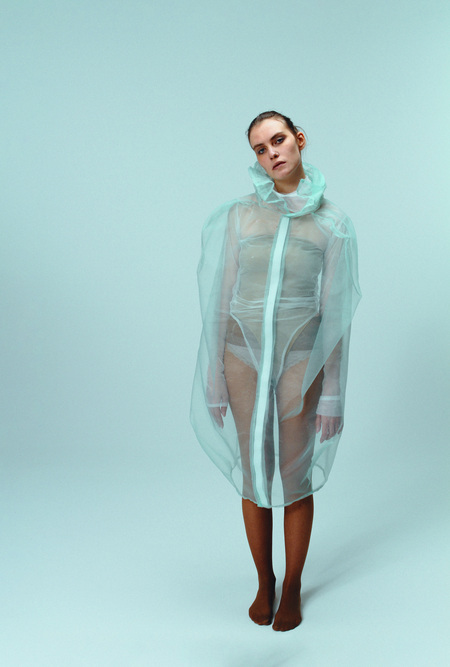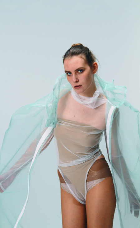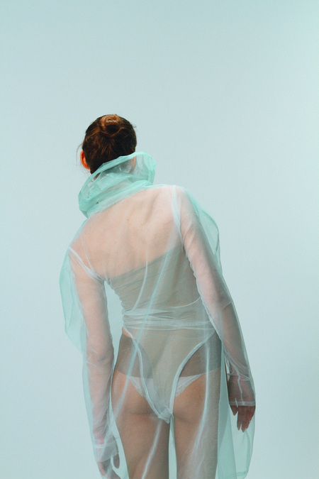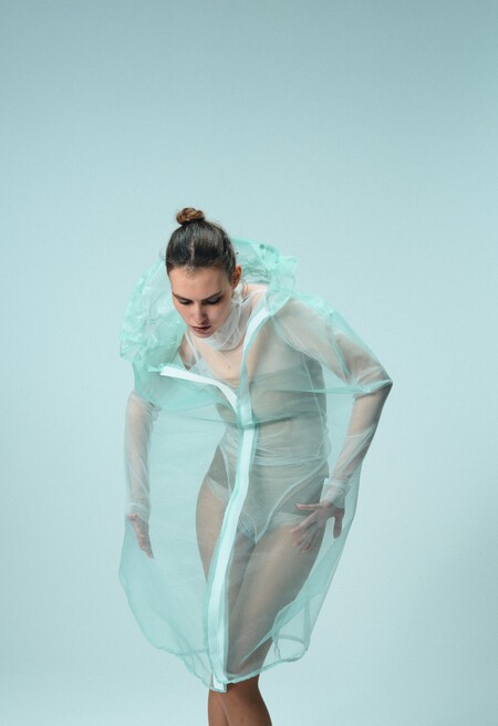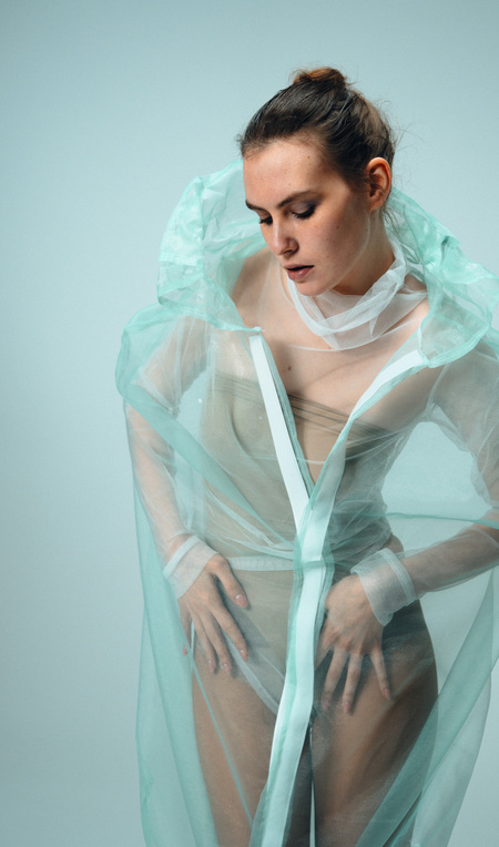 Проект отражает идею одноразовости моды через образ пластиковых бутылок — предметов, созданных для мгновенного использования и немедленного выбрасывания. В изделии воспроизводится их форма и свойства.