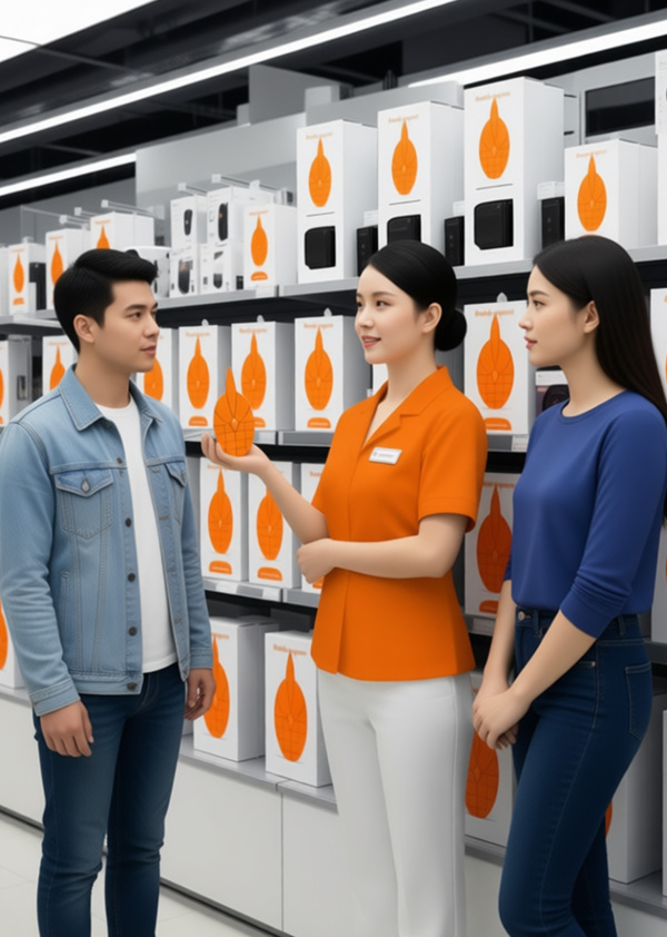 Довольная покупательница позирует с новоприобритенным устройством в магазине (задумывалась как продавец, но получила иную роль)