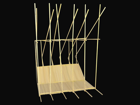 В основе конструкции лежит стоечно-балочная система, состоящая из вертикальных стоек и горизонтальных балок, образующих ритмичный каркас. Такая система обеспечивает жесткость и устойчивость, а также создает визуальную динамику за счёт повторяющихся элементов. В данной конструкции стойки выполнены из деревянных брусьев, закреплённых под углом, а балки соединяют их, формируя открытую пространственную раму, которая одновременно служит и несущим элементом, и архитектурным акцентом.