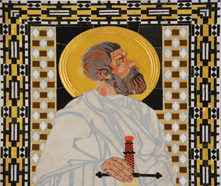 Внутреннее убранство церкви отделано белым мрамором с позолоченными деталями: венками, ангелами и другим. Цветные витражи с изображениями святых являются основным источником света. А мозаики, одна из которых расположена позади алтаря, в свою очередь также демонстрируют библейские сюжеты, тем самым привлекая внимание посетителей к сакральному месту в здании. Панно содержит большое количество разнообразных цветов и орнаментов, которые напоминают переплетённые растения. В центральной мозаике изображена радуга, которая в свою очередь символизирует «знамение завета» между Богом и Ноем.