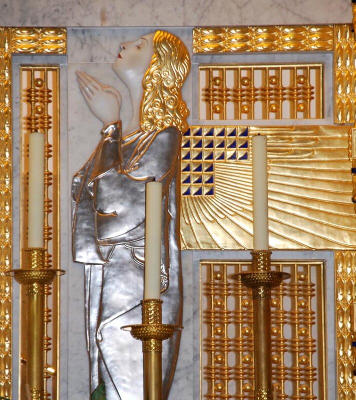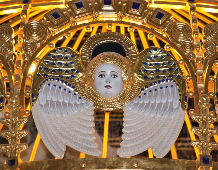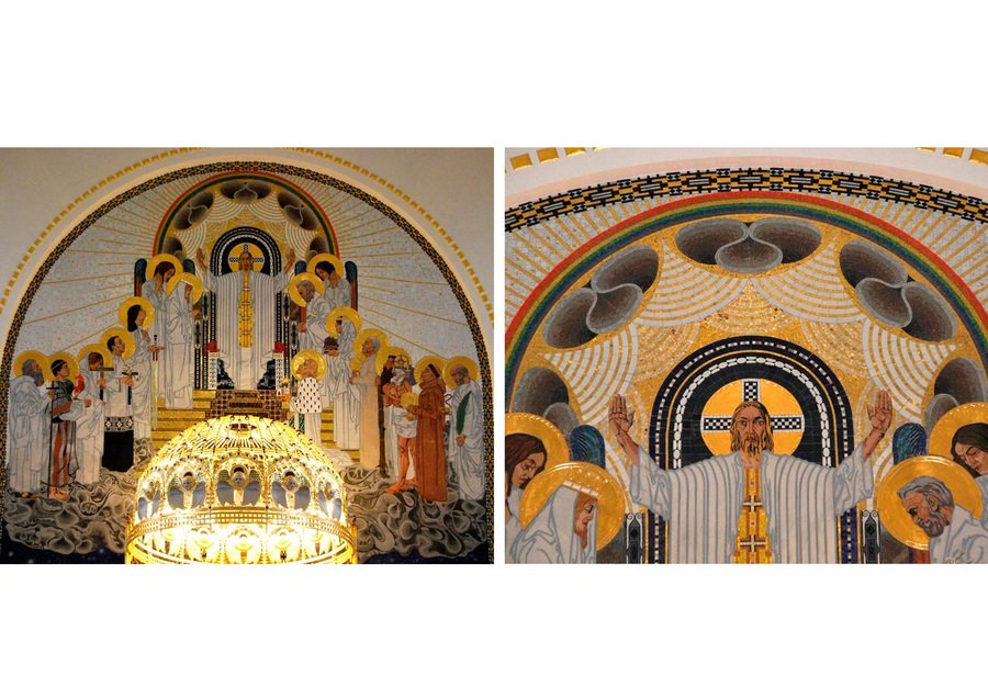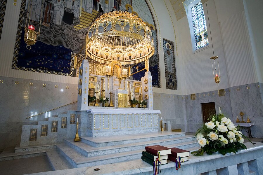 Отдельное внимание следует обратить на главный атрибут церкви Ам-Штайнхоф — алтарь. Он облицован точно таким же материалом с узорчатым декором, что и все стены интерьера, а над ним располагается золотой купол с лицами и крыльями ангелов по всей окружности.