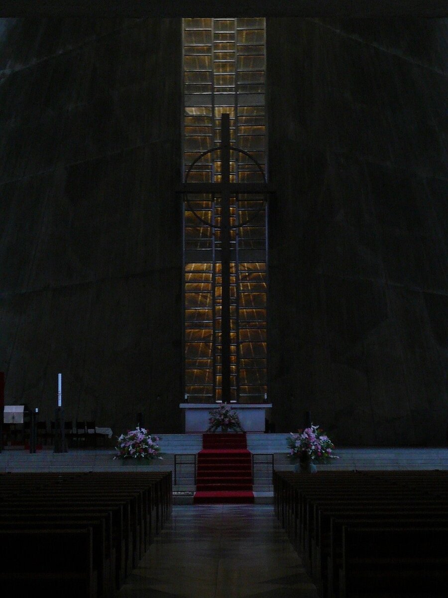 Важным местом в сакральной постройке является алтарь. Направление к нему задаёт красная яркая дорожка, лежащая на лестнице, и жёлто-оранжевый тёплый витраж позади высокого креста на подиуме. Данные атрибуты являются единственными цветовыми акцентами в ахроматическом пространстве интерьера. Стоит обратить внимание, что напротив алтаря расположен большой, геометрический орган на балконе.