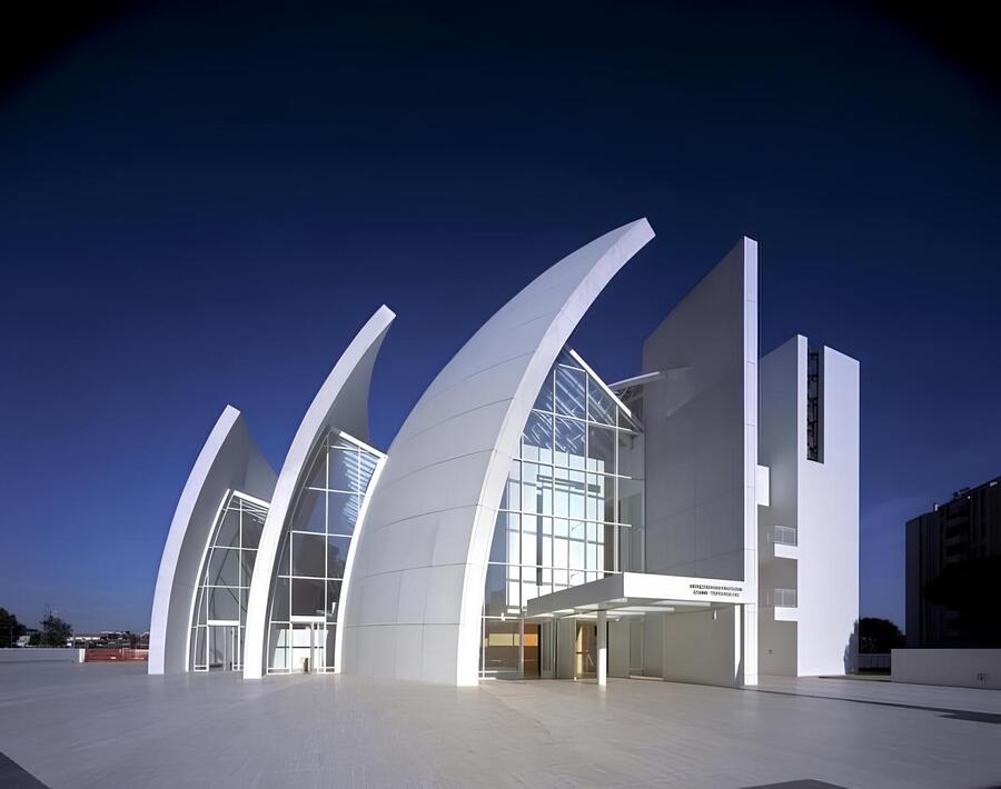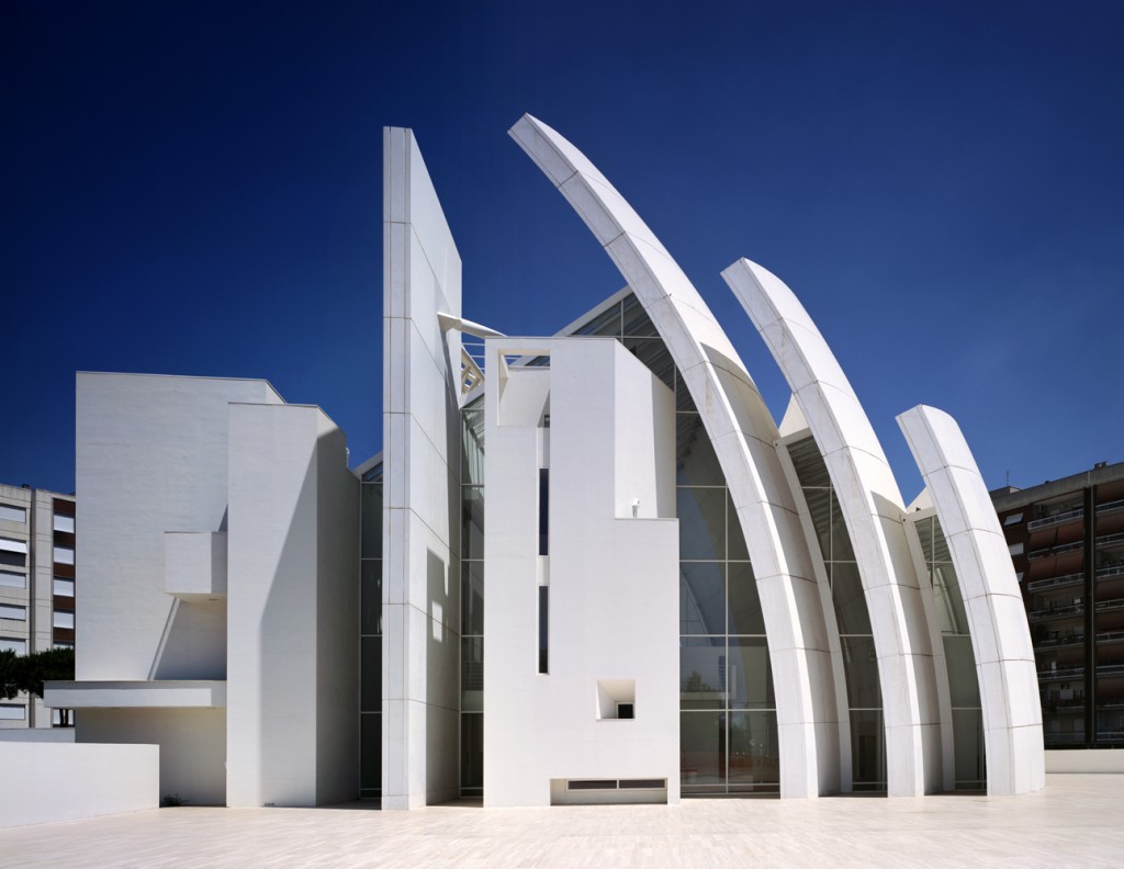 При взгляде на церковь Дио Падре Мизерикордиозо архитектора Ричарда Мейера, невольно складывается ощущение схожести здания с рядом трёх белоснежных парусов и мачтами. С внешней стороны постройки можно обратить внимание на большое количество остекления у церкви, что придёт общему объёму здания особую воздушность. Белые изогнутые «паруса» создают свой ритм в композиции, а прямые вертикальные и горизонтальные линии усложняют геометрию рисунка. За счёт наслоения объёмных фигур создаётся дополнительный рисунок, изменяющийся благодаря игре светотени, которая накладываясь на здание становится равноправной частью в композиции церкви. Дуги, использованные в данном архитектурном решении, являются главным акцентом, придавая активную динамику данной сакральной постройке.