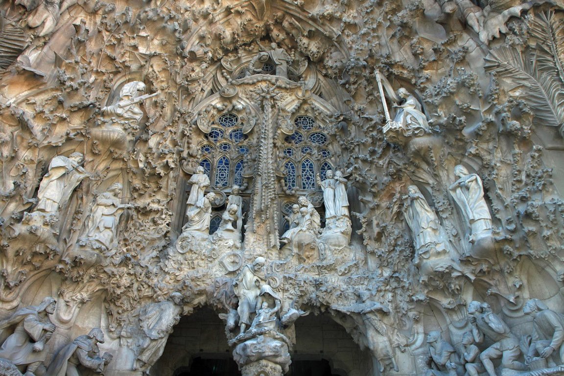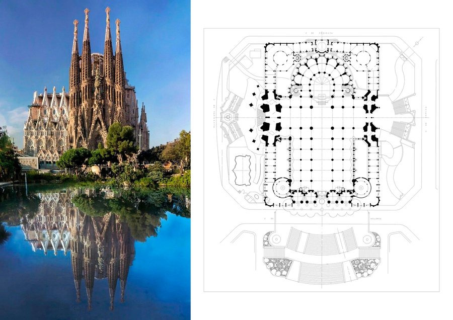Снаружи здание выглядит хаотично за счёт своей ажурной несимметричностью, тогда как план храма имеет не строгую, но симметричную форму, напоминающую латинский крест. На фасаде можно наблюдать 18 высоких башен, каждая из которых посвящена своему апостолу. Такая активная вертикальная динамика вверх может символизировать стремление к Богу. Весь фасад буквально состоит из скульптур и лепнины, демонстрирующих библейские сюжеты и элементы различных растений, папоротников, ракушек и другого. Каждый элемент на фасаде имеет символическое значение, так как для Гауди было важно показать единение человека с природой, тем самым усиливая связь с Богом. Вход в храм осуществляется через три портала, которые также примечательны своим богатством в декоре. Именно в этом здании Гауди удалось соединить функцию и форму, применить законы природы в архитектуре и продемонстрировать эффективное использование пространства и материала. Также хочется обратить внимание на одну из частей — фасад страстей, где портал символизирует жертвенность Христа и выглядит как сильно натянутые связки, над которыми располагаются колонны, похожие на человеческие рёбра.
