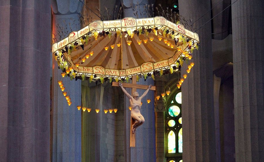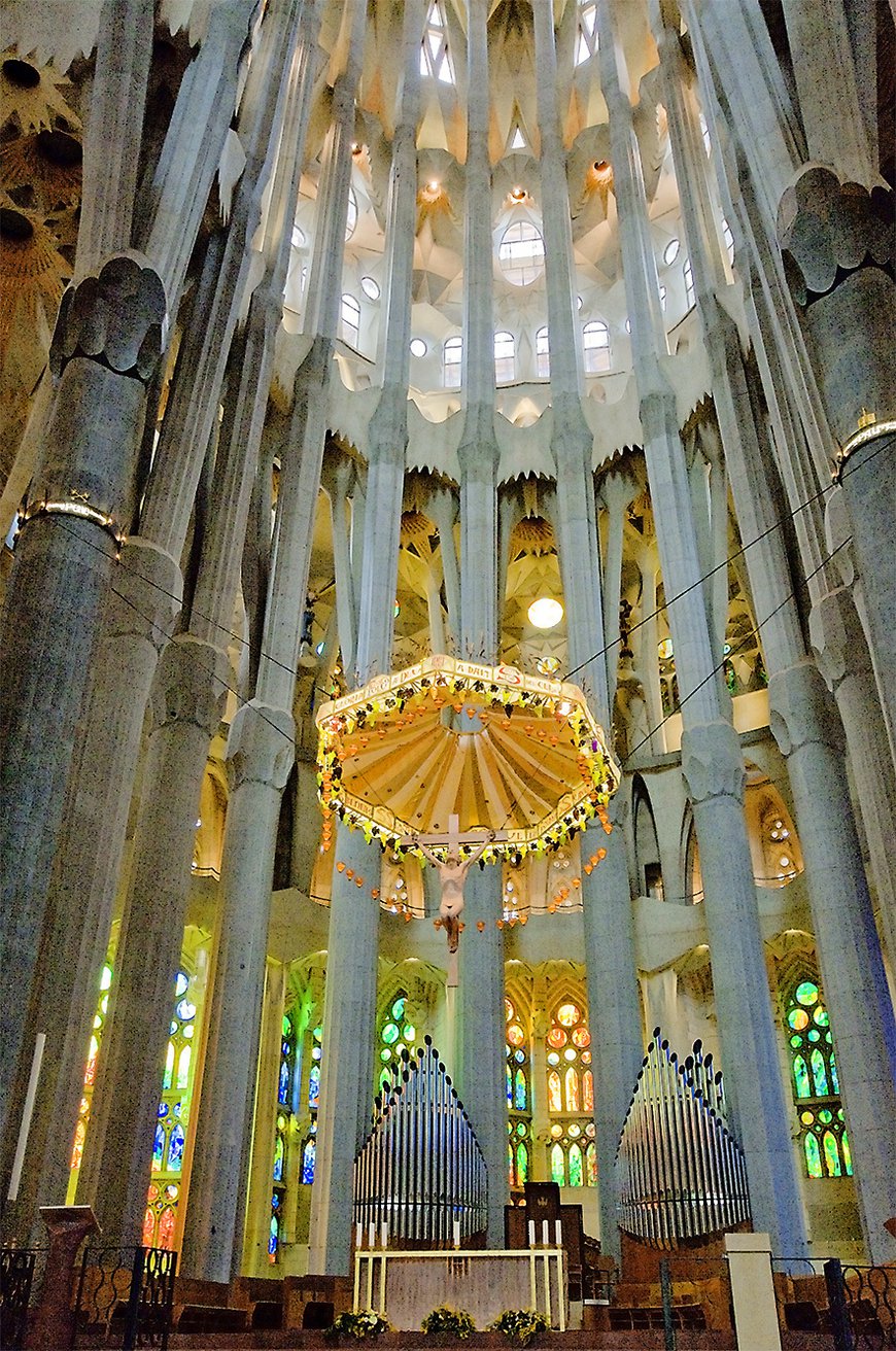 Главный элемент алтаря — семиугольный балдахин, украшенный, кованой пшеницей и пергаментом с надписями, за алтарём расположены два органа. На втором уровне висят гроздья винограда, а ещё ниже мы можем видеть лампады. Ну и наконец, центр данной конструкции — распятие Христа.