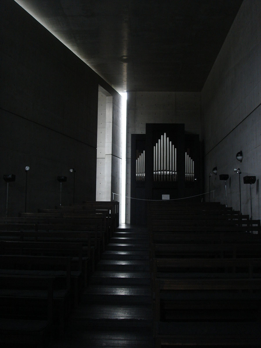Внутреннее убранство смотрится умиротворённо и сумрачно, так как основным источником освещения является только узкое окно в форме креста, которое указывает путь к алтарю — самому сакральному месту здания. В интерьере всё сделано из бетона, кроме деревянных лавочек и пола. А напротив алтаря стоит скромный на вид орган. Тадао Андо верит, что в свете заключается «сила», благодаря которой архитектуру можно одушевить. Для него эта сила настолько велика, что узко направленный свет из крестообразного окна становится не просто единственным источником освещения, а центральной концептуальной составляющей архитектурного решения.