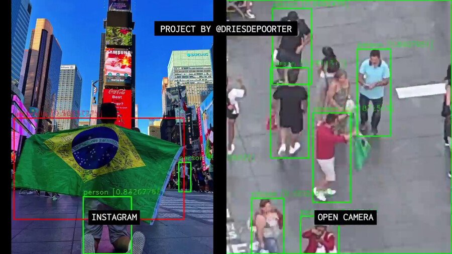 Дрис Депортер создал онлайн-проект «The Follower», где машинное зрение коллажирует реальные стримы с уличных камер с постами людей в соцсетях по времени и местоположению. В итоге получаются коллажи, которые противопоставляют фото, сделанное человеком и машинное видение, демонстрирующее процесс создания этого самого фото. В этом проекте автор опирается на мысль о том, что алгоритмы способны превратить любого создателя контента в объект полной цифровой слежки