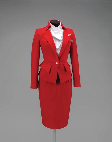 В 2014 году Вивьен Вествуд привнесла свой узнаваемый стиль в облик авиакомпании Virgin Atlantic, создав нынешнюю униформу, отражающую дерзкий характер бренда. Выполненный в фирменном красном цвете, безупречно скроенный костюм отсылает к высокой моде 1940-х годов и к более ранней модели пиджака Вествуд с подчеркнутой талией. Узкая юбка-карандаш с вытачками, высокий воротник и асимметричная жаккардовая блузка с рюшами подчёркивают британскую изысканность и современное видение дизайнера.