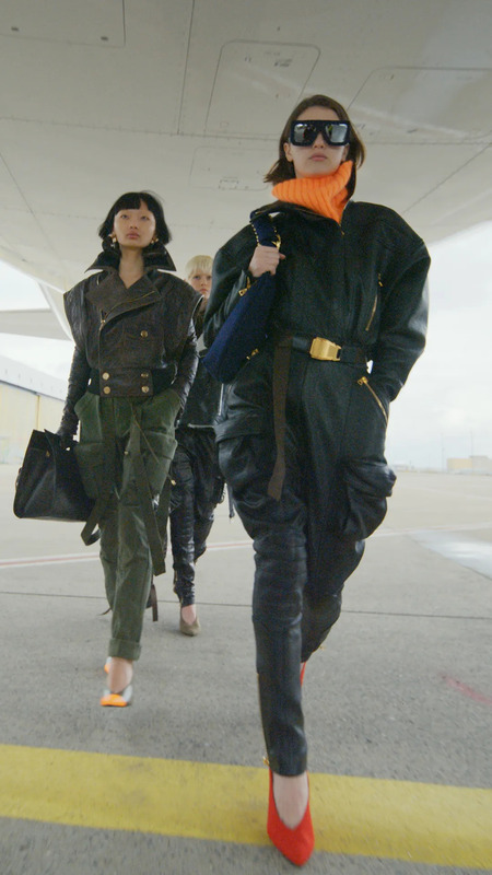 Balmain AW 2021 — дизайнер Оливер Рустен создал коллекцию с авиационной тематикой: куртки-бомберы, комбинезоны в стиле летных форм, утилитарные детали — всё на фоне декора «аэропортного ангарa».