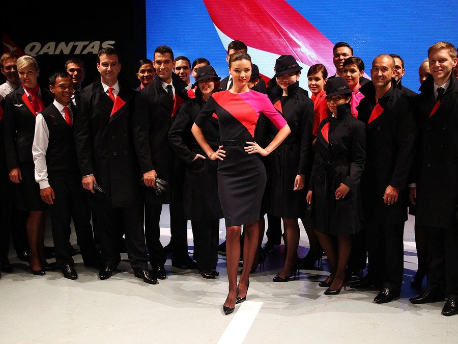 В 1986 году знаменитый французский модельер Ив Сен-Лоран создал униформу для авиакомпании Qantas, которая использовалась до 1991 года. Короткий пиджак в стиле смокинга отличался широкими лацканами, выразительными подплечниками и приталенным силуэтом — чертами, характерными для деловых костюмов Сен-Лорана 1980-х годов. Отделка воротника и манжет придавала образу строгость и элегантность, а яркий узор с летящим кенгуру Qantas на юбке и блузке из хлопка и полиэстера вносил нотку праздничности и динамики.