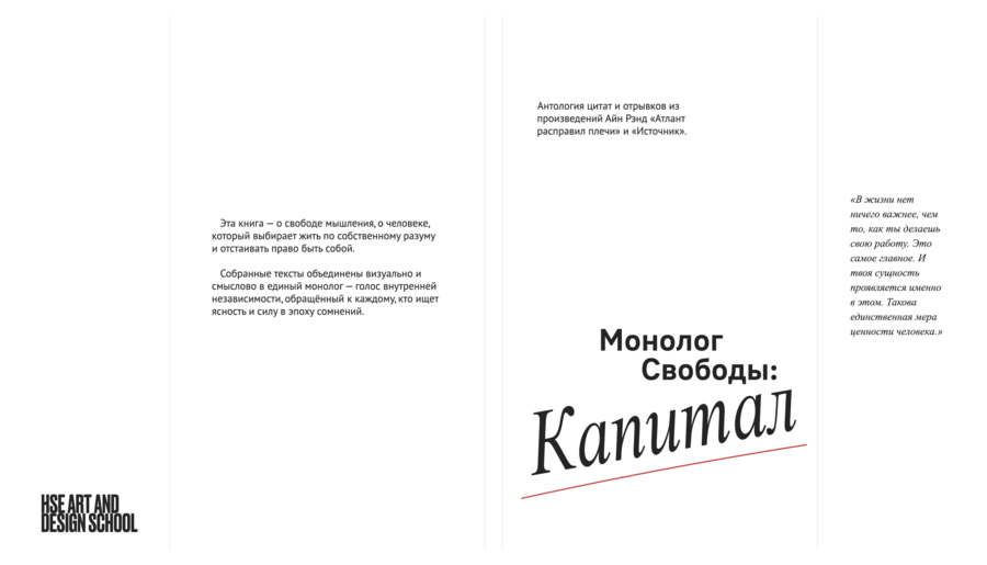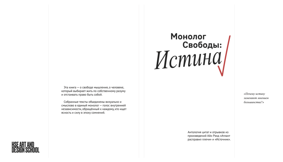 Верстка построена на контрасте шрифтовых пар, отражая противостояние двух диаметрально разных жизненных путей, которые выбирают герои и антигерои книги.