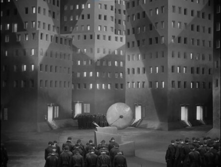 В «Метрополисе» Фриц Ланг использует симметрию в изображении промышленной части города для передачи ощущения полного контроля. Создается ощущение, что его жители — лишь винтики в системе. Например, сцены с симметричными рядами рабочих, марширующих с опущенными головами, подчеркивают бездушный механизм власти.