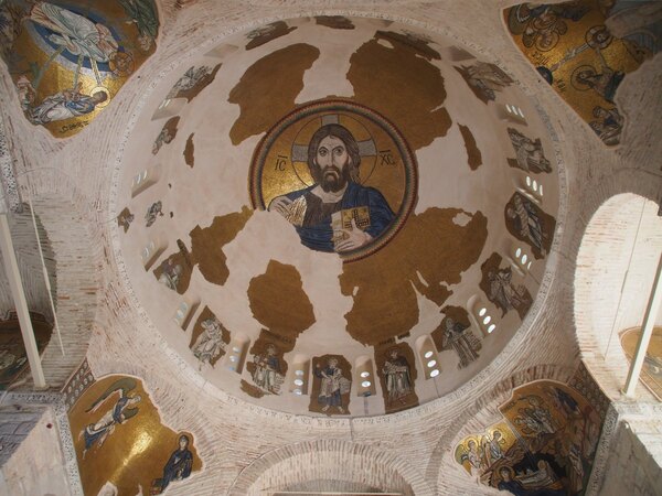 Другой пример — византийские мозаики и фрески (например, купол церкви Святой Софии в Константинополе). Христос изображён в центре купола, сверху, буквально над зрителем. Это образ божественного надзора, ведь куда бы ты ни встал, кажется, что глаза Христа смотрят прямо на тебя.