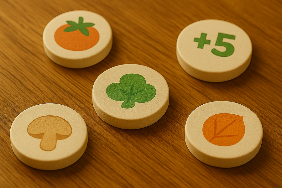 Промт фишек: small realistic 3D ingredient tokens shaped like vegetables, cheese, fish, eggs, and pastries, with some marked for positive and negative points.