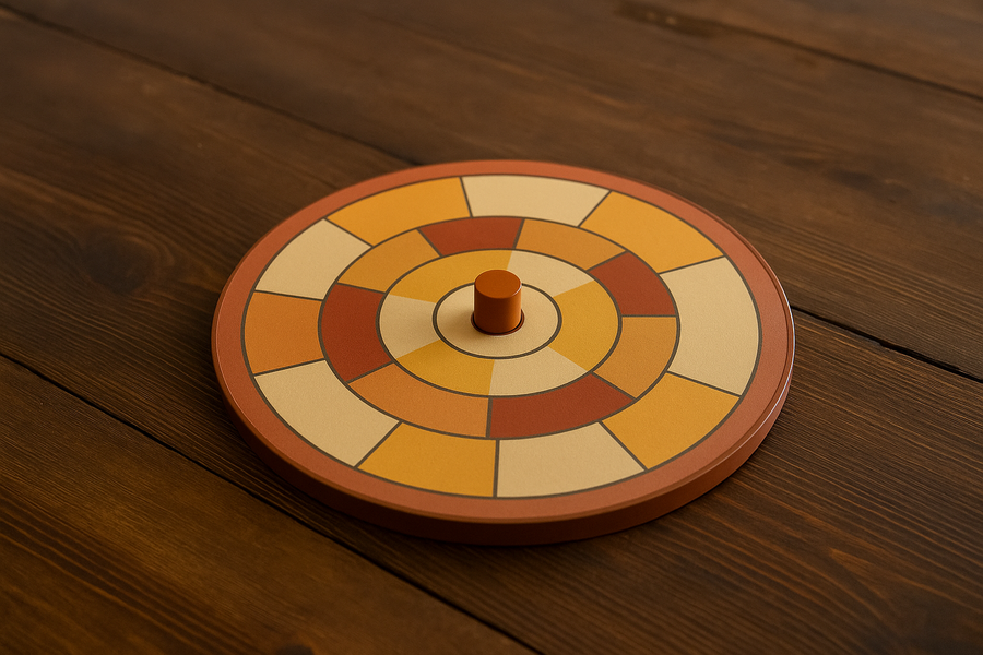 Промт поля: realistic tabletop board game mockup for a funny cooking-themed game, showing a real-life physical game setup on a wooden table, with a round modular board made of three concentric rotating circles (small, medium, large), each divided into color bright orange and cream color palette.